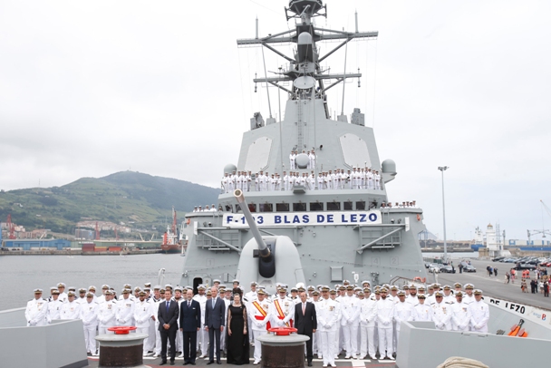 Entregada a la Armada el 16 de diciembre de 2004, es el quinto buque en la historia de la Armada que lleva el nombre del teniente general Blas de Lezo y Olavarrieta, héroe de la batalla de Cartagena de Indias, y uno de los más ilustres marinos de nuestra historia. Tras recibir los honores de ordenanza, el titular de Defensa ha pasado revista a una Compañía Mixta de Honores formada por Escuadra de Gastadores y una sección de Infantería de Marina del Tercio Norte, una sección del Ejército de Tierra, otra de la Guardia Civil y una última de la dotación de la fragata ‘Blas de Lezo’. Siguiendo el ceremonial de la Armada, el presidente del Real Club Marítimo de Abra, Estanislao Rey-Baltar Boogen, organismo que ha confeccionado la enseña nacional, se la ha ofrecido a la Princesa Ana de Francia que a su vez, y tras la bendición de la misma por parte del vicario de la Armada, se la ha entregado al comandante de la ‘Blas de Lezo’, capitán de fragata Rafael Arcos Palacios. Al finalizar su alocución, el comandante del buque acompañado por el oficial de derrota embarcaron en la fragata para el izado de la bandera de combate a los acordes del himno nacional.