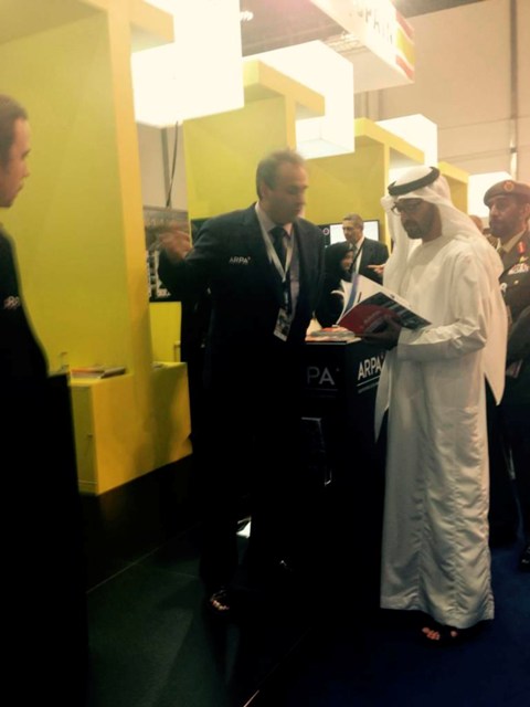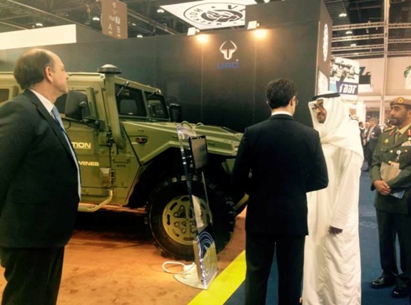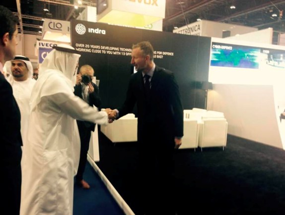 (defensa.com) El Pabellón de España en IDEX 2015 ha recibido esta mañana la visita del Principe Coronado de Abu Dhabi, que ha realizado un recorrido por las seis empresas integrantes. El Sheik Mohammed Bin Zayed Al Nahyan, Segundo Jefe de las Fuerzas Armadas de los Emiratos Aárabes Unidos, comenzó el recorrido por el stand de Uro Vehículos Especiales, para saludar a continuacion a los representantes de Indra, Instalaza, Gaptek, Hisdesat y Arpa.