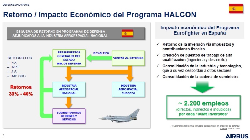 Además de por programas nacionales como el Halcón, se obtienen beneficios económicos derivados de la participación de la industria nacional en programas internacionales, recordando González las actuales campañas comerciales de Eurofighter en Finlandia y Suiza. Independiente de qué país y compañía lidere la campaña de exportación, hay retornos económicos en los países socios del programa. Además de los aviones construidos para los cuatro socios del consorcio Eurofighter, se participa en la construcción de los aviones de exportación, caso de Austria, Arabia Saudí, Omán o más recientemente Kuwait y Qatar. Incluso hay conversaciones entre Italia para una gran venta de equipo de Defensa a Egipto en el que se incluirían aviones Eurofighter, campaña que lidera la multinacional italiana Leonardo.
