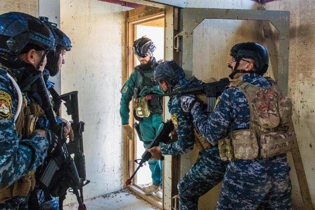 Fotografía: Un miembro del GAR, al fondo con uniforme verde, instruyendo a fuerzas del Ministerio del Interior de Irak (Foto: estado Mayor de la Defensa).