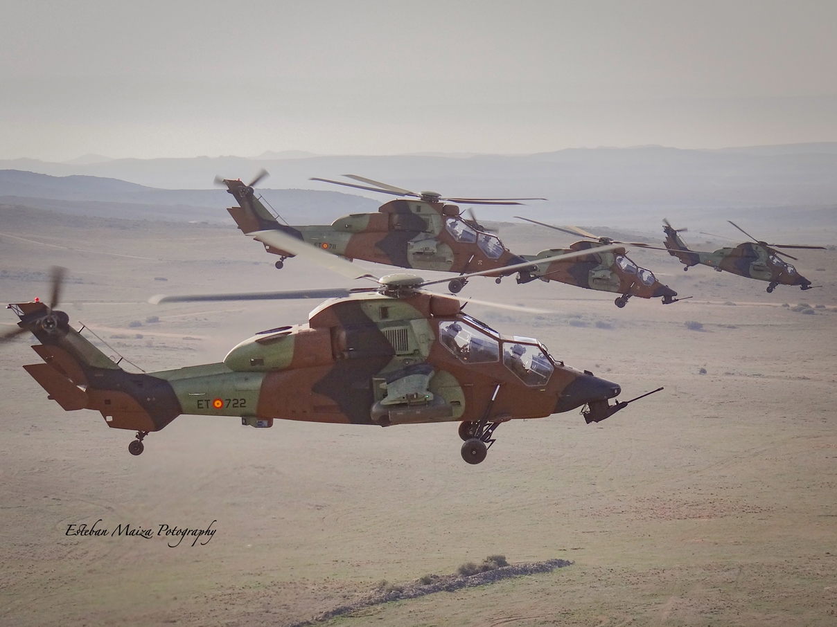 Una compañía de cuatro helicópteros Tigre rompiendo formación. (Esteban Maiza)