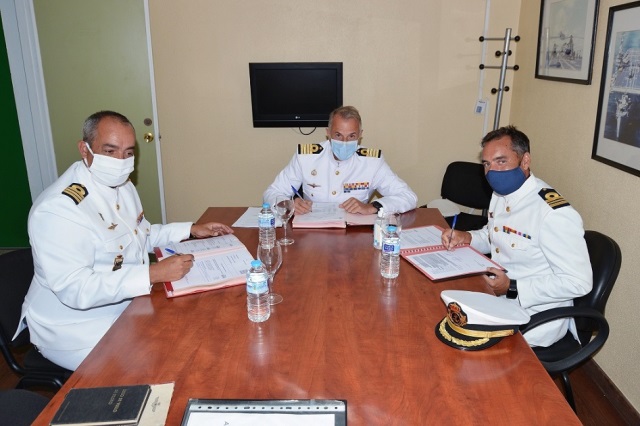 Fotografía: Momento del relevo del mando en la Quinta, en el centro el COMFLOAN, y a su derecha el nuevo Comandante de la Unidad, el capitán de corbeta Fernando Pérez. (foto Armada).