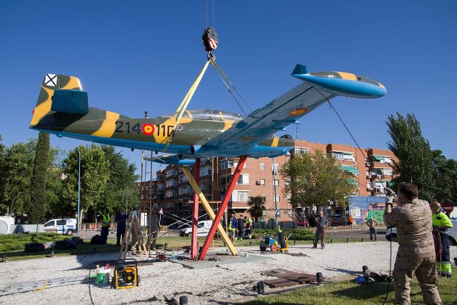 La localidad madrileña de Getafe, cuna de la aviación española, expone de nuevo en una de sus rotondas un histórico avión de combate HA-220 Súper Saeta, operado en su día por el Ejército del Aire español. La restauración de la aeronave se llevó a cabo en la Base Aérea de Getafe, una de los más antiguos campos de aviación españoles y que hoy en día comparte sus pistas con las aeronaves que fabrica y prueba la multinacional Airbus Defence & Space. La aeronave, uno de los múltiples monumentos a la aviación con que cuenta el municipio, fue desmontada de su soporte de la rotonda de la Plaza de Pinto el pasado 29 de noviembre para proceder a su restauración. Se trata del Hispano Aviación (compañía absorbida en 1971 por CASA (ésta a su vez se integró en Airbus DS)) HA-220 Súper Saeta matriculado A.10C-110, la versión reconvertida a monoplaza para dar apoyo táctico a tierra, partiendo de las células de los entrenadores Hispano Aviación HA-200 Saeta. Además, el estudio histórico de la aeronave, realizado por su propietario formal el Museo de Aeronáutica y Astronáutica del Ejército del Aire, determinó aplicar un esquema de pintura como el que llevó cuando estaba en servicio en la década de los setenta del pasado siglo. Así, el nuevo esquema de pintura sustituye al anterior gris plateado por el más bélico que usaba en el Escuadrón 214, como atestigua el indicativo de fuselaje 214-110, unidad que tenía sede en la base aérea de Morón (Sevilla). El avión restaurado regresaba a su pedestal habitual de la rotonda de la Plaza de Pinto el pasado 3 de julio, con ayuda de una grúa con pluma de grandes dimensiones, lo que obligó al corte al tráfico rodado en las circunvalación sur del casco urbano de la villa madrileño. (Julio Maíz Sanz) Fotografía: El “nuevo” HA-220 “Súper Saeta” colocado en Getafe. (foto Julio Maíz/defensa.com)