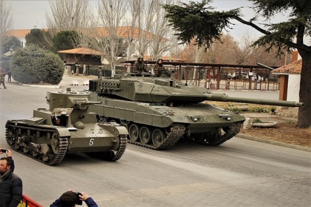 ·El paso de un carro Leopardo 2E junto con un T-26 de la época de la Guerra Civil, cerró la jornada de la Inmaculada en “El Goloso”. Foto: Julio Maíz/defensa.com.