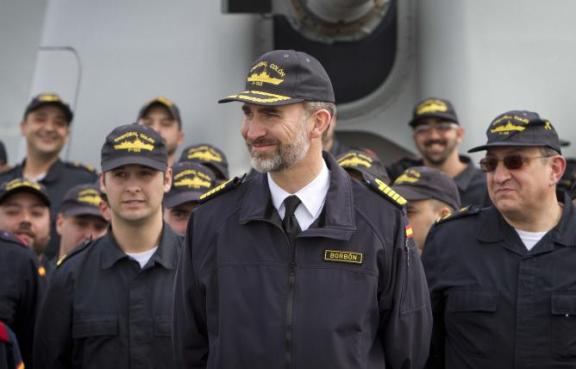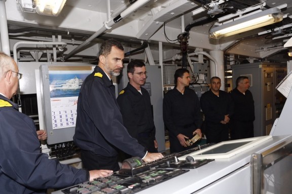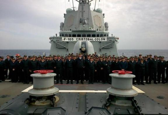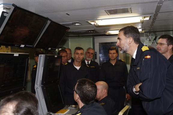 A su llegada a la fragata ‘Cristóbal Colón’, Don Felipe fue recibido por el almirante Santiago Bolíbar y por el Comandante de la ‘Cristóbal Colón’, capitán de fragata Enrique Núñez de Prado. Tras los honores de ordenanza por parte de la Guardia de Honor, Felipe VI saludó a una comisión de la dotación del buque.