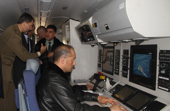 A continuación se trasladó a la plataforma de aeronaves del Centro de Logístico de Armamento y Experimentación (CLAEX), en la que se encuentra el grupo de aviones del SAER y donde subió a un avión Airbus Defence & Space CN235, para asistir a un simulacro de misión, en el que se enlazó con el avión de la Guardia Civil destacado con FRONTEX al sur de Italia efectuando misiones de vigilancia. De regreso a la plataforma de aeronaves del Servicio Aéreo, Don Felipe se fotografió con el personal del Servicio Aéreo y firmó en el libro de honor.