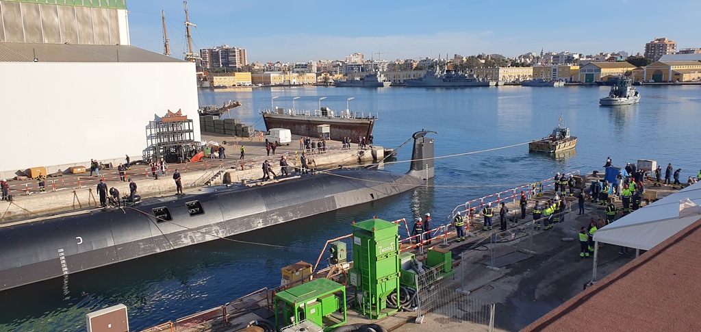 El pasado día 23 el astillero de Navantia en Cartagena era testigo del amarre del submarino S-81 “Isaac Peral”, operación que tenía lugar una vez finalizados los trabajos que debían realizarse en seco. Tras la maniobra, el buque quedó amarrado en el muelle, donde se preparará para sus próximas pruebas de puerto y de mar.