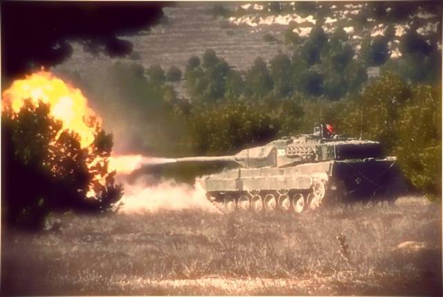 Fotografía: Leopardo 2E abriendo fuego en el CENAD de San Gregorio (ET)