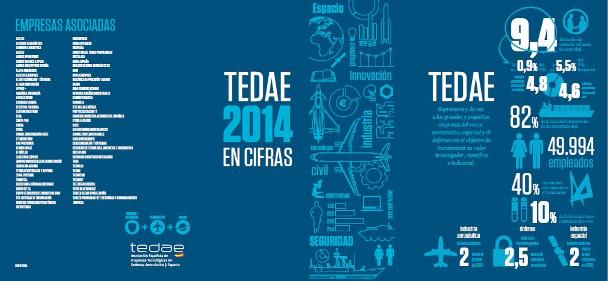 (defensa.com) La facturación de TEDAE (la Asociación Española de Empresas Tecnológicas de Defensa, Aeronáutica y Espacio) durante 2014 alcanzó los 9.400 millones de euros, repartidas casi equitativamente entre el mercado civil (4.600) y el militar (4.800). Representa una caída del 5 % respecto al ejercicio anterior (9.900 millones) y supone un 0,9 % del Producto Interior Bruto del país, pero un 5 % del Producto Interior Bruto Industrial. Las cifras revelan que el 82 % de la facturación se destina a la exportación (sube desde el 79 %) y que se reinvierte en Investigación, Desarrollo e Innovación (I+D+i) el 10 % de la facturación. El empleo cae ligeramente hasta los 49.994 trabajadores (respecto a los 51.183 del ejercicio 2013). TEDAE destaca que la facturación de las aéreas de aeronáutica y espacio se ha duplicado desde 2006 y que los tres sectores en que se organiza la asociación son 3 veces más productivos que la media española.