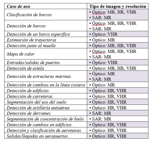 Listado de los principales casos de uso de SEDA en inteligencia geoespacial, junto con los tipos de imagen y resoluciones compatibles. (HI Iberia)