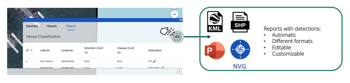Los resultados obtenidos tras el procesamiento pueden exportarse en distintos formatos, adaptados a los estándares operativos y necesidades del usuario. Entre ellos se incluyen formatos OTAN (ISRSPOTREP, RECCEXREP, NSIF), archivos geoespaciales (KML, SHAPE, NVG) y reportes personalizados en PowerPoint (PPT) cuando se utiliza el despliegue en entornos terrestres.