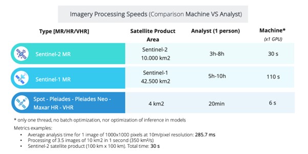Comparación del tiempo requerido para procesar imágenes satelitales mediante SEDA frente al análisis manual de un experto, demostrando la aceleración y automatización proporcionada por la inteligencia artificial.