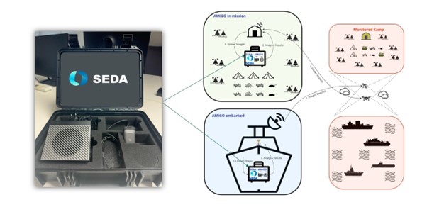 El sistema SEDA ofrece capacidades avanzadas para su despliegue en Centros de IA y puestos de mando centralizados, no obstante las posibilidades de utilización de la IA en situaciones tácticas requiere de soluciones adaptadas para su despliegue en escenarios altamente cambiantes y con comunicaciones degradadas, donde entra en juego el módulo AMIGO (Advanced Module for AI Edge Computing). Esta capacidad permite su incorporación fácil en sistemas embarcados y entornos aislados, donde la infraestructura de comunicaciones es limitada o inexistente. Gracias a esta versatilidad, SEDA puede operar de manera autónoma en vehículos aéreos, terrestres y marítimos, así como en escenarios offline o dentro de burbujas 5G, asegurando el procesamiento de datos incluso en condiciones adversas.