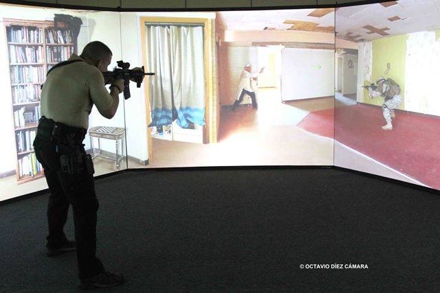 Fotografía: Los simuladores de tiro virtual, como este VIRTRA, añaden muchas capacidades formativas a las agencias policiales. (Octavio Díez Cámara)