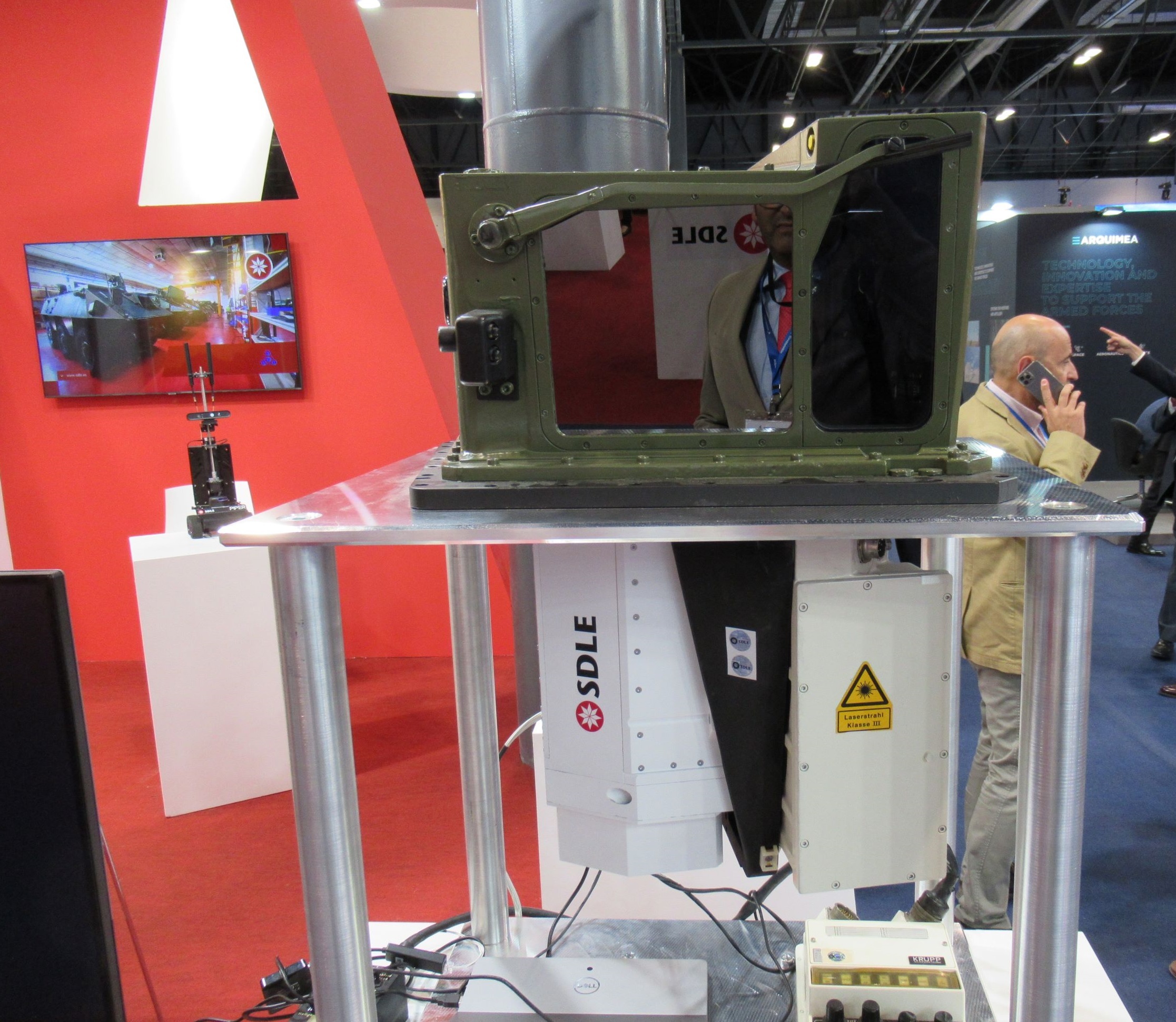Por el otro lado estaba el sector de optrónica, parte del concepto de la empresa respecto a lo que es el mantenimiento evolutivo de sistemas de armas. En esta ocasión nos mostró dos sistemas completamente operativos, por un lado, la cámara térmica del VRC Centauro, dotada de un detector de 3 a 5 µm, en servicio en los vehículos del Ejército de Tierra español y del jordano, y en el otro la cámara térmica de 3ª generación con detector de 8 a 12 µm que se incorpora en el periscopio del tirador del carro de combate Leopard.