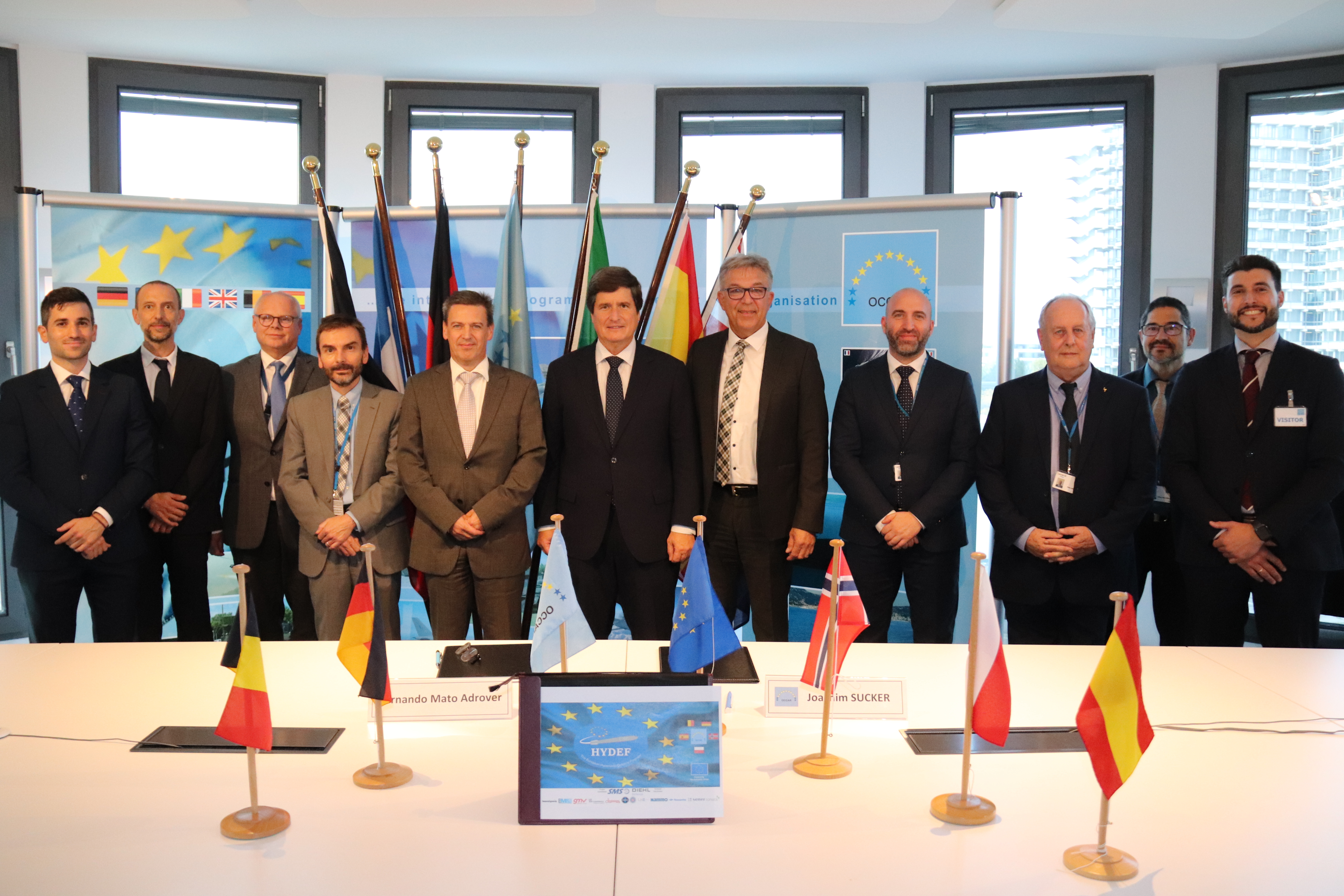 En concreto, el director de OCCAR-EA, junto con el consorcio HYDEF compuesto por 14 socios industriales de siete países (Bélgica, República Checa, Alemania, España, Noruega, Polonia y Suecia) y representado por SMS (asociado en nombre de los Estados participantes de OCCAR en HYDEF como son Bélgica, Alemania, Noruega, Polonia y España) firmaron el denominado Acuerdo de Subvención (Grant Agreement o GA) en nombre de la Comisión Europea y el Contrato de Adquisición Vinculada (Linked Procurement Contract o LPC) de HYDEF.