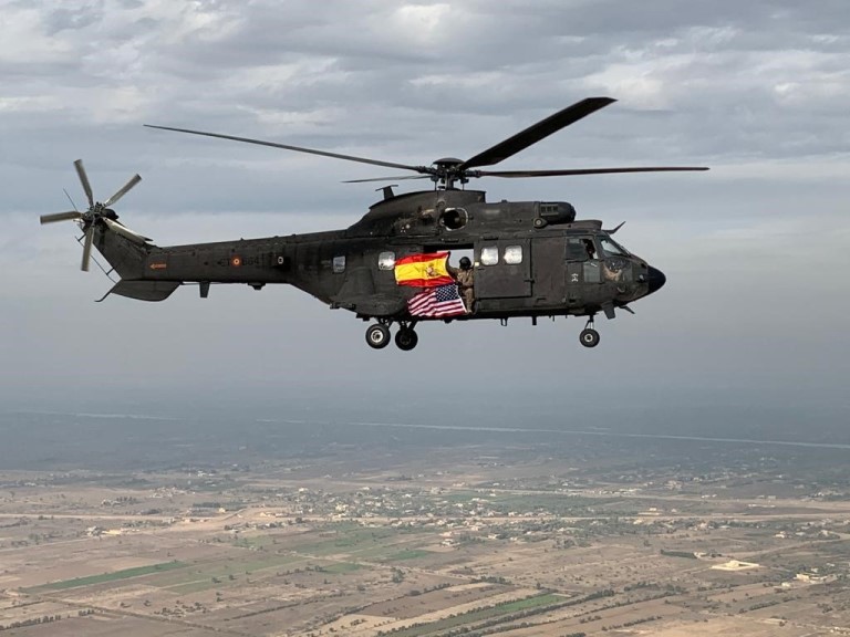 Uno de los Airbus Helicopters AS532UL “Cougar” de las Task Force “Toro” mostrando las banderas de España y Estados Unidos.