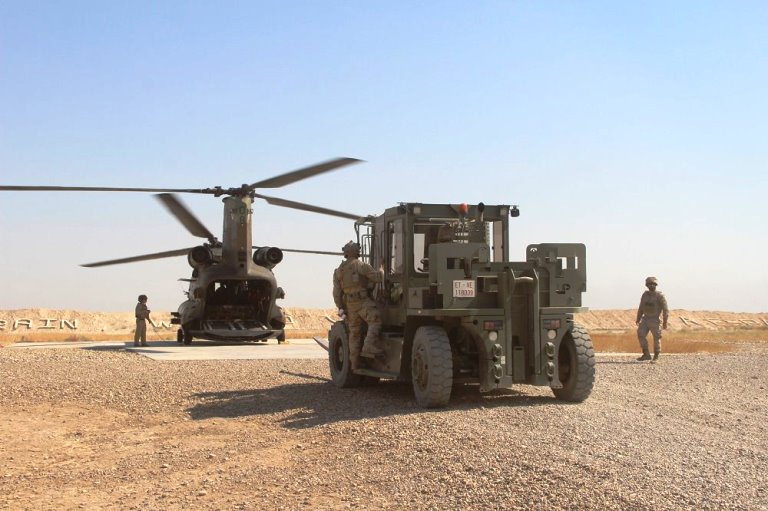 Operación de descarga de material de un CH-47D “Chinook” en la base de Besmayah.