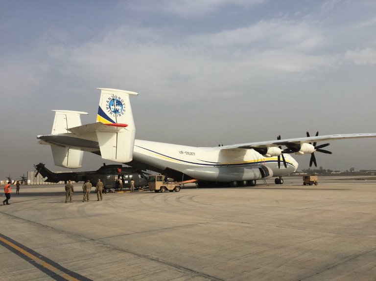 Personal de la Task Force “Toro” descarga de un Antonov An-22 uno de sus AS532 “Cougar” en la plataforma de Camp Taji.