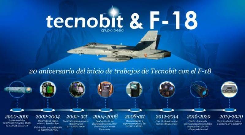 En base a esta trayectoria Tecnobit pudo suministrar y mantener los displays centrales del F-18 del Ejército del Aire español, para toda la flota de estos aviones con base en Torrejón de Ardoz y Zaragoza. Un reto que se llevó a cabo a plena satisfacción del cliente y que aún continúa realizando, gracias a las sucesivas renovaciones de los contratos de mantenimiento. Como parte de este soporte continuo al Ejército del Aire español se han realizado también otras importantes curas de obsolescencia en la cabina del F-18, concretamente para la cámara HVC del Head up Display.