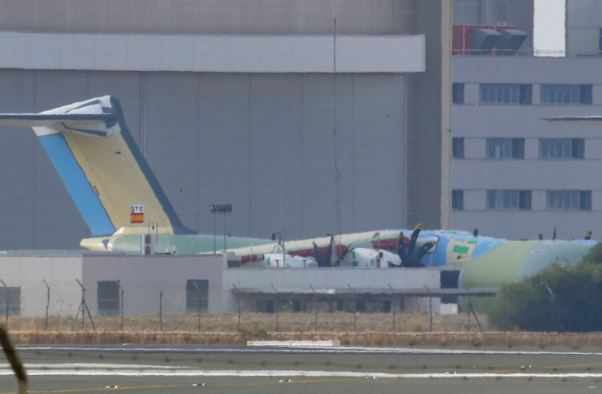El que será el segundo A400M del Ejército del Aire, destaca que ya lleva los pod bajo sus alas. Foto: José Antonio Almarza Madrera.