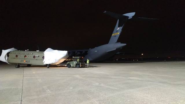 El helicóptero llegó procedente de Filadelfia (Pensilvania) a bordo de un avión de transporte Boeing C-17A Globemaster III de la Fuerza Aérea de los Estados Unidos o la United States Air Force (USAF), de los que opera su mando de movilidad aérea o Air Mobility Command (AMC).