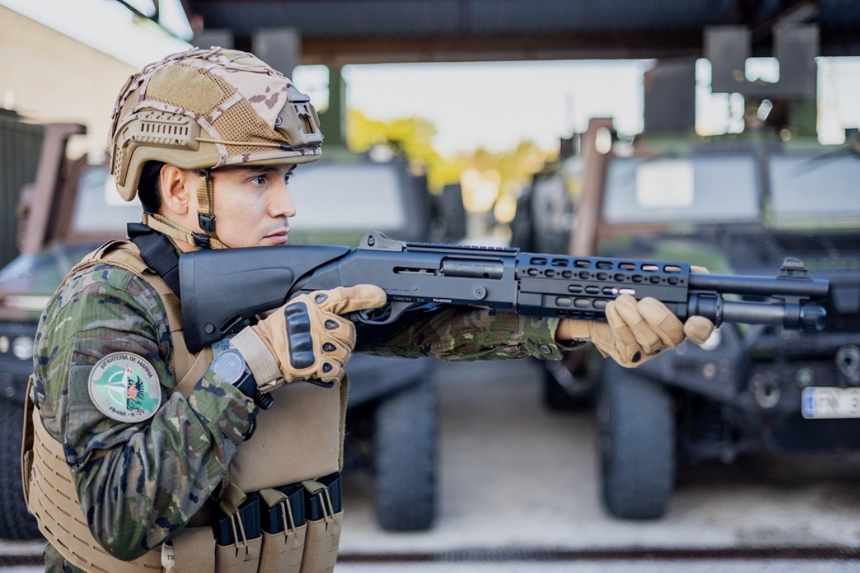 Los primeros usuarios de la BRIMAR-TEAR de la nueva escopeta Benelli M4A1 son los destacados en Rumania, el profesional de la imagen lleva el parche de dicha Fuerza. (foto Tercio de Armada)