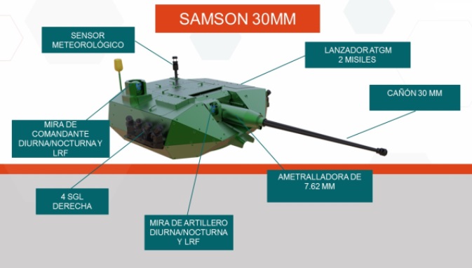 Ahora hemos podido saber que la torre Samson 30 alojará en su interior 230 proyectiles para el cañón Mk44 de 30 mm. y otros 500 para la ametralladora coaxial de 7,62 mm., ambas armas pudiendo recargarse desde el interior de la torre, además de los 8 lanzafumigenos distribuidos en grupos de cuatro a cada lado, además de los ya citados dos misiles Spike. Una escotilla en la parte superior permite además asomar la cabeza al jefe del vehículo si la situación lo requiere, al estilo de las torres tripuladas.