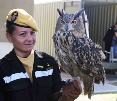 Finalmente se ha presentado a la prensa a la mascota de la UME, un búho hembra, de año y medio de edad, bautizada como “Lume”, que se incorporó el pasado diciembre al Cuartel General. La principal cuidadora del búho real, la cabo primero Ruth, que hace funciones de cetrera y en buena parte de bióloga, nos comentaba que diariamente se la hace volar, y se atiende con precisión su dieta de forma que no coja sobrepeso. También hemos podido saber que “Lume” vive en una amplia instalación sita junta a la de los halcones que utilizan los cetreros para mantener la pista de la base libres de aves que puedan provocar un temido strike bird contra una aeronave.
