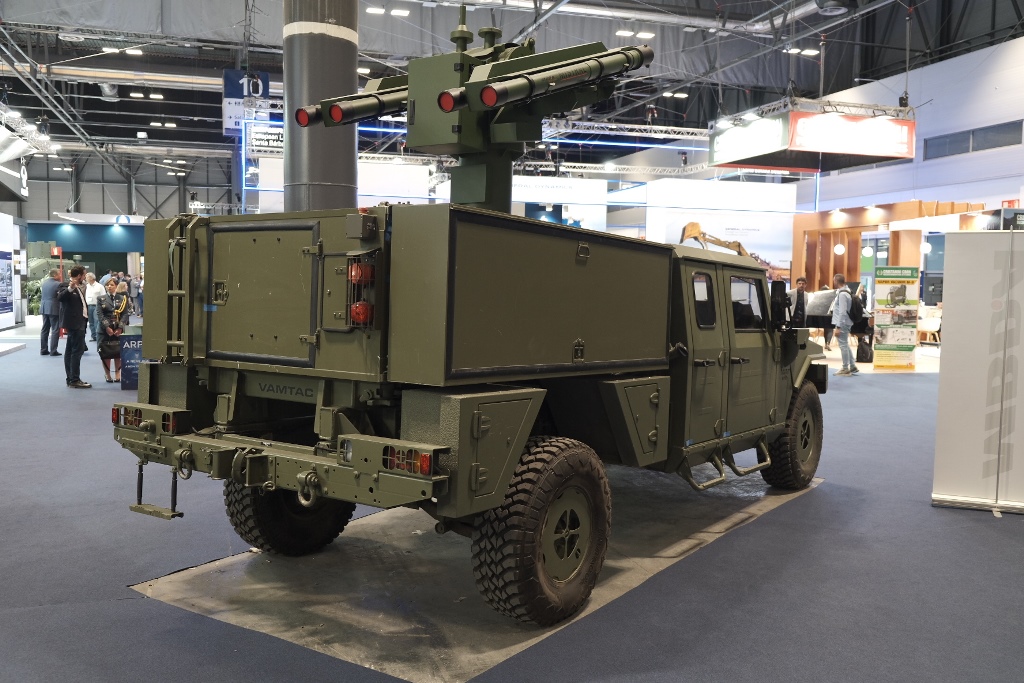 MBDA mostraba el lanzador de misiles aire-superficie ATLAS-RC sobre otro VAMTAC. Destacar que se trataba de una configuración muy parecida a la presentada en 2017 luego denominada “Jabalí” por el Ejército de Tierra, pero ahora con un lanzador cuádruple en lugar de doble si bien la zona de carga que aloja el lanzador es similar.