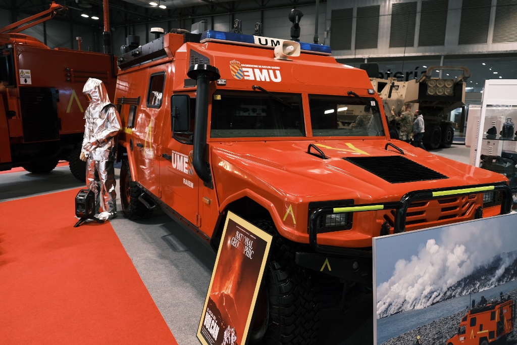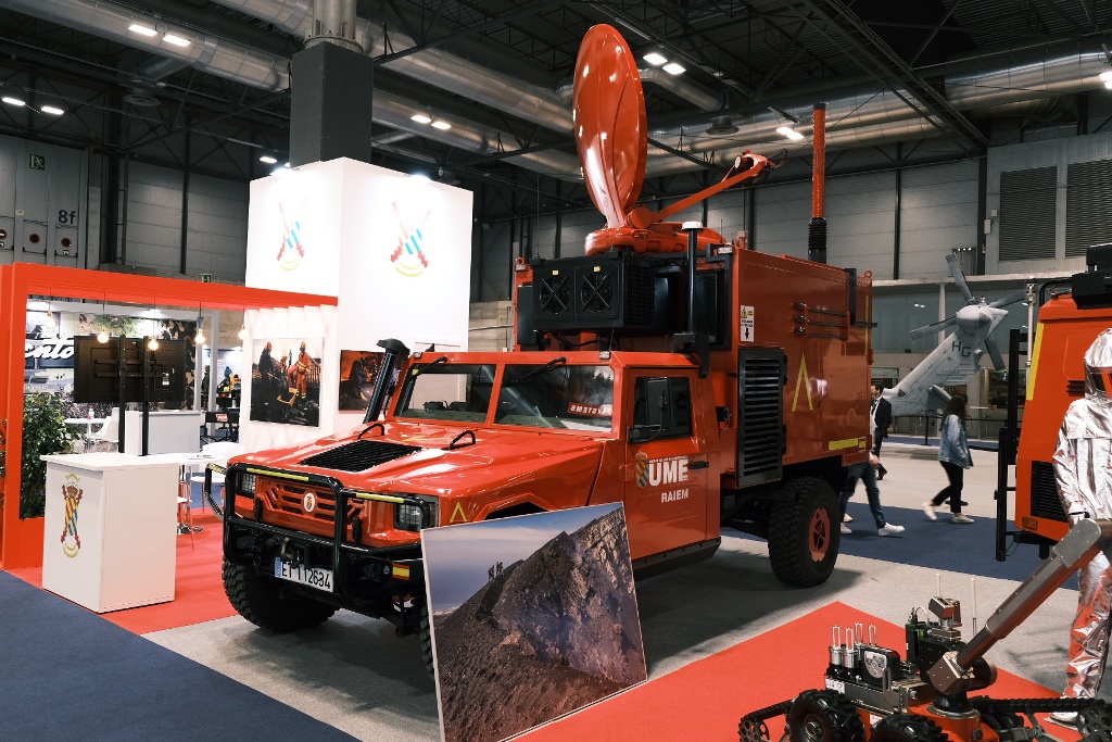 La Unidad Militar de Emergencias mostraba dos de sus llamativos VAMTACS, asignados al Regimiento de Apoyo e Intervención en Emergencias o RAIEM. Uno estaba configurado como shelter de comunicaciones por satélite y otro era el vehículo de reconocimiento Velire para misiones NBQ. En el estand del grupo español Tecnobit – Grupo Oesía se mostraba otro VAMTAC con equipos de comunicaciones embarcadas y displays de la empresa. (José Mª Navarro García)
