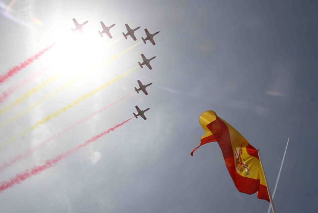 Finalizado este homenaje comenzó el desfile aéreo, en el que participaron 61 aeronaves, incluyendo las de la Patrulla Águila, que cerraban la parada aérea. Destacó la presencia por primera vez ante el público español del A400M del Ejército del Aire, aunque no pudieron asistir a la cita los CN235, haciéndose público a esas horas que uno de ellos había participado en el rescate de embarcaciones con emigrantes en el Mar de Alborán.