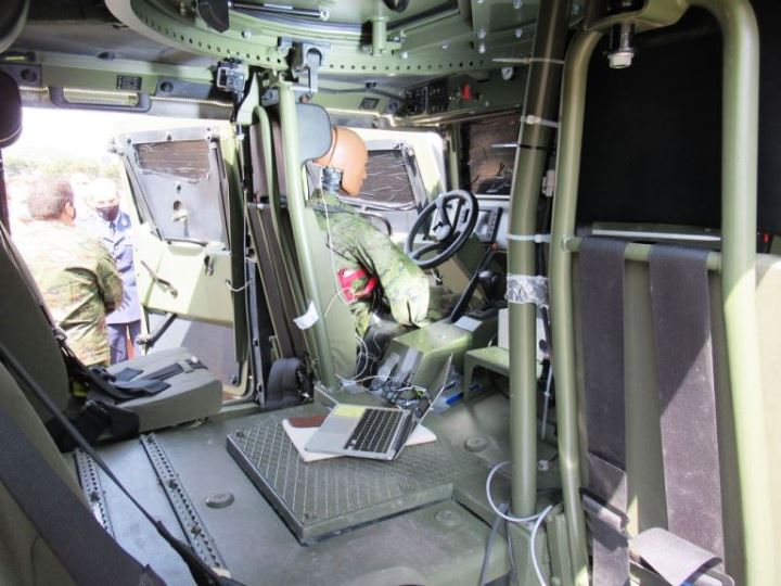 foto: El interior del VAMTAC con el dummie sensorizado para analizar la prueba (autor)