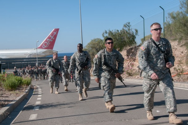 Los militares estadounidenses llegaron al aeropuerto de Almería, el más cercano a los acuartelamientos de la Legión sitos a Viator, que es la base de la Brigada de la Legión, a bordo de un Boeing 767 de la compañía comercial Omni. La aeronave realizó un vuelo directo desde Texas, dado que desde 2011 la División está basada en Fort Bliss, una gigantesca base militar cuyas zonas de instrucción se adentran en el colindante Estado de Nuevo Mexico, que fue cuando regresó a Estados Unidos tras estar 40 años basada en Alemania.