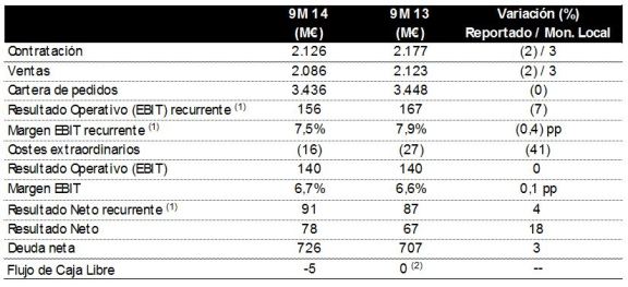 El resultado atribuible ha ascendido a 78 M€, lo que representa un aumento del 18% sobre el mismo periodo del año anterior por los menores gastos extraordinarios. La contratación se sitúa en 2.126 M€ y es un 2% superior a las ventas, en línea con el ratio del tercer trimestre de 2013. Destaca el crecimiento de la contratación en AMEA con un aumento del 43% reportado. En España, se mantiene una tasa positiva.