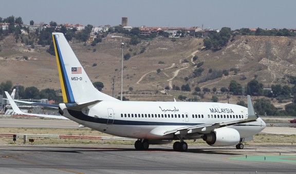 ·El Boeing 737-700 de las Reales Fuerzas Aéreas de Malasia aterrizando en el aeropuerto Adolfo Suarez Madrid-Barajas.