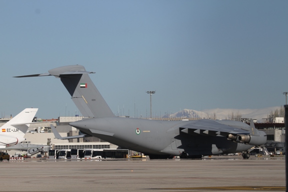 2- El C-17A de las Fuerzas Aéreas de los Emiratos Árabes Unidos en la plataforma del aeropuerto de Madrid-barajas, al fondo, a la derecha, podemos ver un Airbus A330-200 de Air Europa.