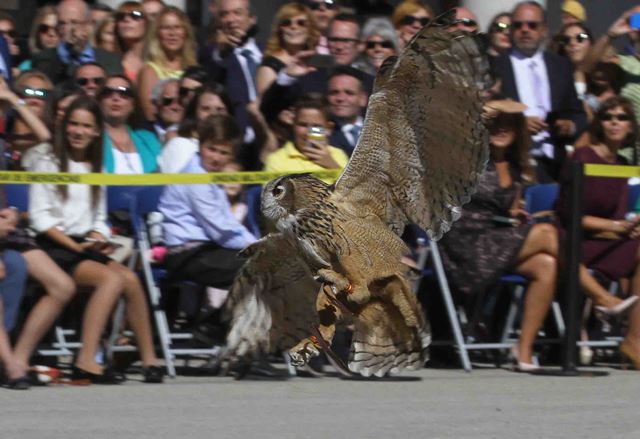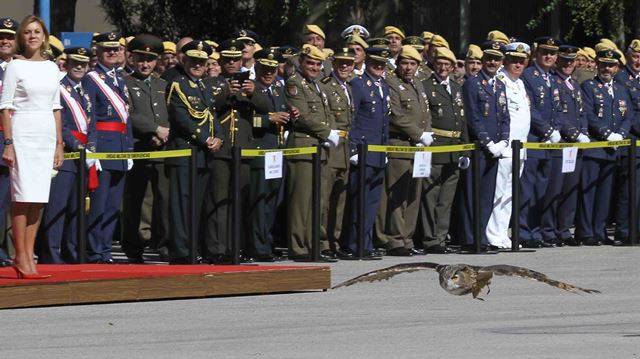 Los actos de celebración del XII Aniversario de la UME tuvieron una protagonista de excepción, la mascota de la Unidad, el búho hembra Lume, que realizó su primer vuelo de demostración ante la mirada de los cientos de asistentes, incluida la ministra de Defensa, María Dolores de Cospedal.
