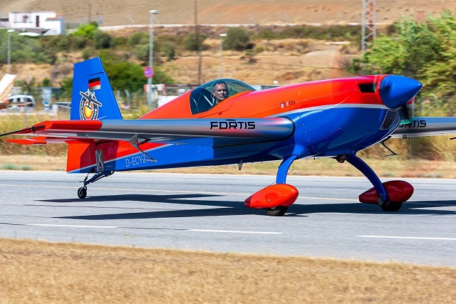 El avión acrobático Extra 330 LX de Juan Velarde, despegando desde el aeródromo de la Axarquía. (Vélez Málaga).