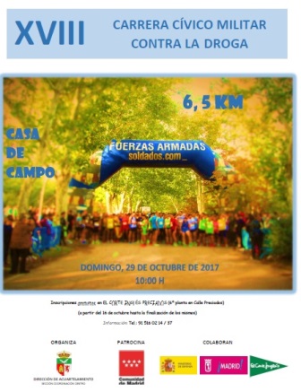 El próximo domingo 29 de octubre tendrá lugar en la madrileña Casa de Campo la edición XVIII de la Carrera Cívico-Militar, organizada por la Dirección de Acuartelamiento (DIACU) en el marco de las actividades del Programa de Prevención de Drogodependencias (PPD).