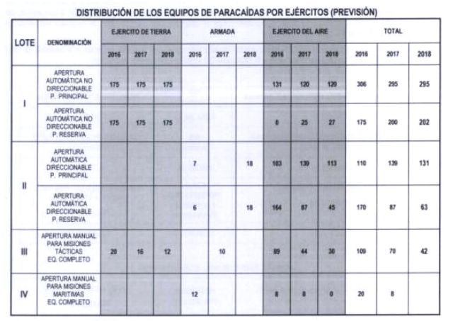 Sin embargo en enero de 2016 estos dos primeros lotes quedaron desiertos por no haberse presentado ninguna oferta admisible de conformidad con los pliegos. En tabla anexa se desglosa la distribución prevista en 2015 de estos equipos de paracaídas para los tres Ejércitos entre los años 2016, 2017 y 2018 extraída del Pliego de Cláusulas Administrativas Particulares (PCAP) que acompaña a la licitación. Desconocemos si las anualidades que estaban previstas para 2016 serán entregadas en 2017, 2018 o si se repartirán entre los dos años de que consta el período de formalización. (José Mª Navarro García)