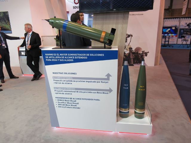La compañía presentaba en su stand sus soluciones de largo alcance para artillería, empezando por lo que la compañía denomina “alcance extremo” gracias al proyectil con guiado preciso impulsado por ramjet que ofrecería más de 150 km. de alcance. En el denominado “alcance extendido” Nammo ofrece desde proyectiles convencionales de alta precisión dotados de la tecnología aerodinámica de culote rebajado “base bleed” que ofrecen más de 40 km. de alcance, de hecho esta munición ha pasado recientemente las pruebas con el sistema de fabricación alemana PzH2000.Además participa en diferentes desarrollos de municiones de alcance extendido como son la Bonus (base bleed), la Excalibur (base bleed), el XM1128 (base bleed) y el XM1113 (asistida por cohete).
