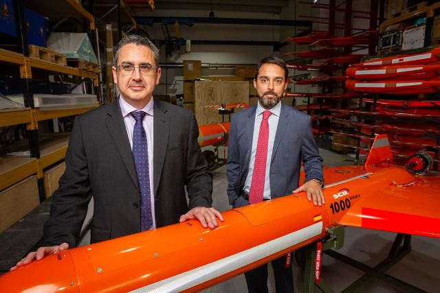 José Antonio Ceballos, director general de SCR, y Andrés Aylagas, director de target drones, posan junto a la unidad 1.000 producida por SCR (SCR)