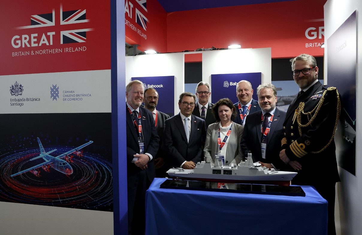El Ministro de Defensa Nacional, Fernando Barros Tocornal, inauguró el pabellón del Reino Unido en la FIDAE 2026 y recorrió las instalaciones donde se exhibe una maqueta de la fragata Arrowhead 140, ofrecida por Babcock International con interés en construcción local en los Astilleros y Maestranzas de la Armada de Chile (ASMAR).