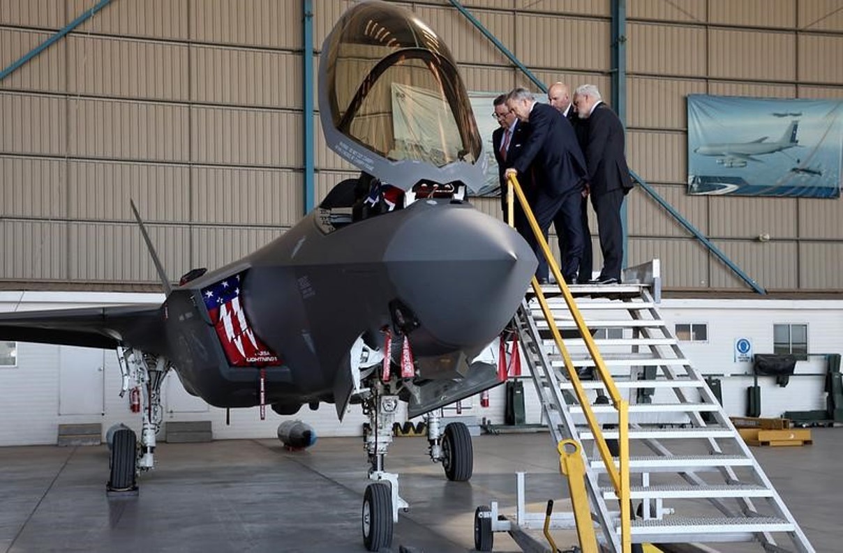 Ministro de Defensa Fernando Barros junto al Subsecretario para las FF.AA y Defensa y el Embajador Brandon Judd observando el interior de la cabina del F-35 Lightning II de la USAF.