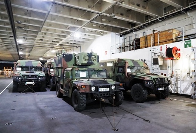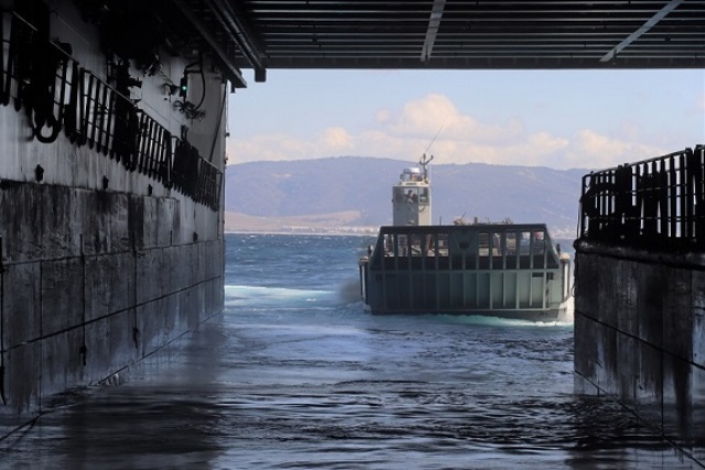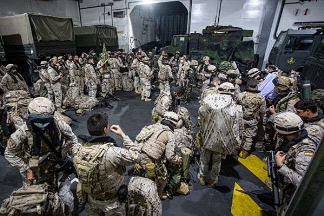 En sus amplias cubiertas de vehículos el navío puede llevar el material de la Infantería de Marina (IM) española.