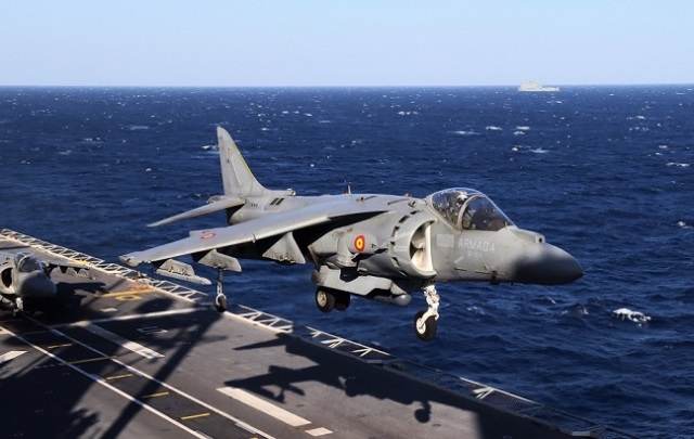 Un cazabombardero “Harrier” II a punto de tomar en la cubierta del JCI, de 202,9 metros de longitud, estamos ante el único navío de la Armada desde el que pueden operar aeronaves de ala fija.
