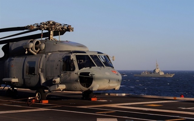 Un de los “nuevos” helicópteros SH-60F “Oceanhawk” de la Quinta Escuadrilla trincado en la cubierta del JCI.