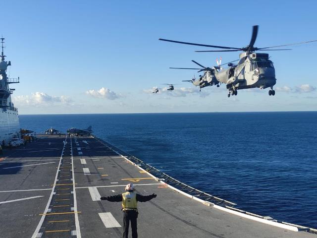 El JCI es el principal medio de la Armada para efectuar operaciones aéreas tanto de aeronaves de ala rotatoria (derecha) como de ala fija, al fondo se ven tres “Harrier”. (foto Armada)