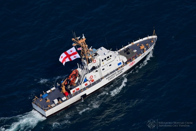El navío más pequeño de la formación naval, que compensa su gran bandera de Georgia, el patrullero “Ochamchire” (P-23).